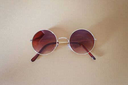 Circle fashion sunglasses on bright yellow background. Summer hipster accessories flat lay with copy space for text or picture. Summer vacation top view. Colorful design for cards. Stock photo.
