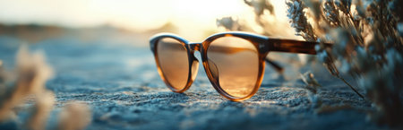 sunglasses on a wooden table during a sunset at sea