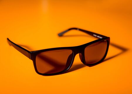 Sunglasses on the yellow table. Orange background. Isolated