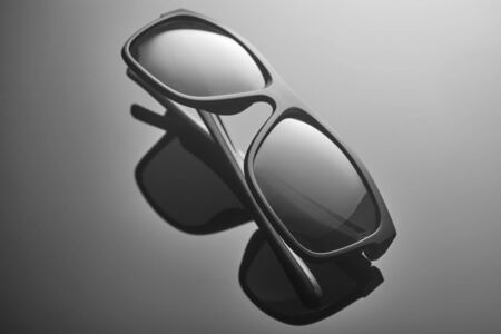 Mens sunglasses on a gray gradient background with reflection. Place for text.