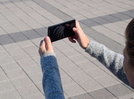 Moscow, Russia - June 02, 2019: Woman takes a photo on the modern smartphone on Red Square in Moscow at sunny summer day closeup
