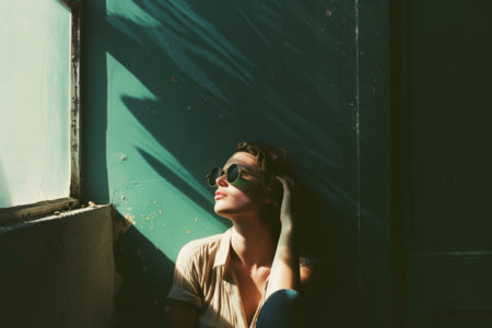 Woman Wearing Sunglasses Leaning Against a Green Wall