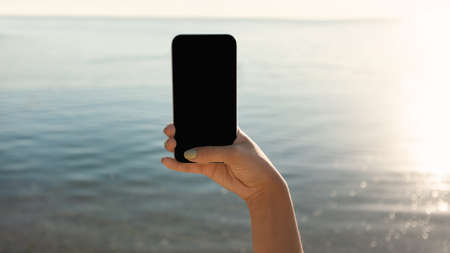 Female Hand Holding Smartphone With Empty Screen In Front Of The Sea Outdoors. Mockup, Cropped, Panorama