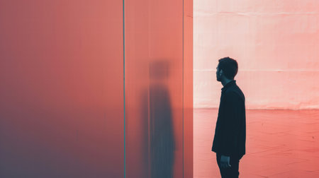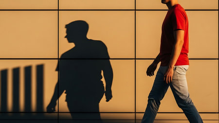 A lone figure stands in front of a wall, with shadows of identical shapes creating a powerful scene of self-identity and confidence.