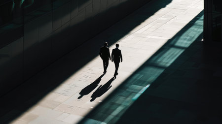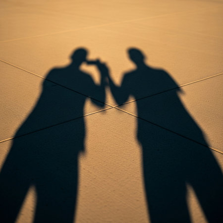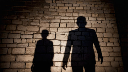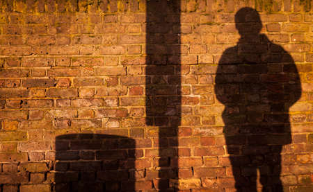 Shadows cast on a brick wall at night evoke a mysterious atmosphere of tension and intrigue between two figures