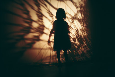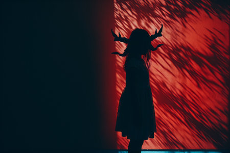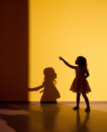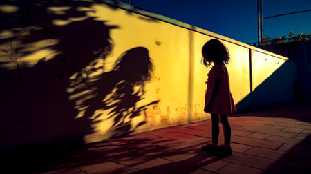 Little girl standing in front of wall with shadow on it. Generative AI.