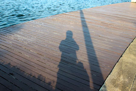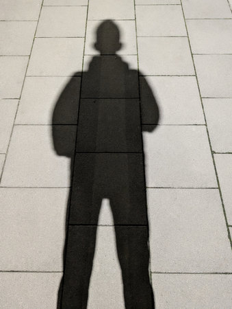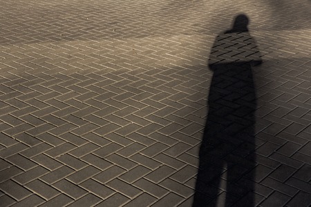 the shadow of a man on a sidewalk. anonymity of the big city.