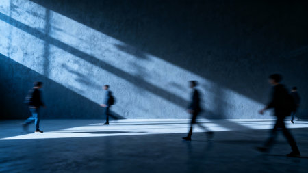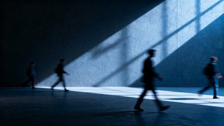 Silhouettes of people walking in a dark corridor with shadows on the wall