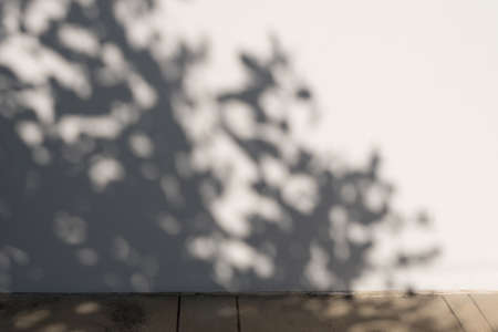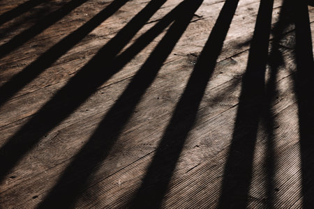 Dramatic contrast long shadows cast across a weathered wooden deck in natural sunlight. The strong contrasts of light and shadow creates an interesting abstract pattern on aged wood terrace surface.
