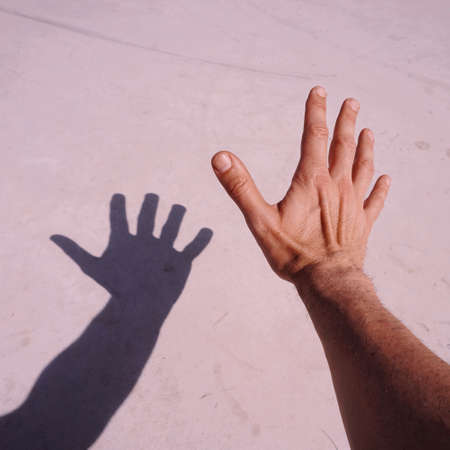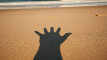 Shadow of a hand on the beach. Conceptual image of a person's hand on the sand.