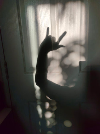 Shadow Language. A mysterious and artistic image capturing the shadow of a hand on a textured glass door, illuminated by soft natural light.