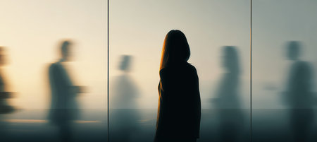 A frosted divider frames a backturned silhouette, while distant motion and an off-axis shadow add depth. The matte glass surface reflects the subtle tension between collaboration and quiet focus in a busy office setting.