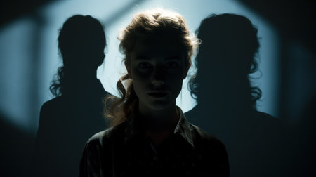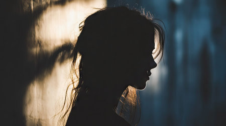Silhouette of an anonymous woman partially hiding her face in deep shadows, creating a mysterious and secretive atmosphere