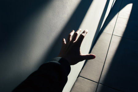 Hand reaching toward a strong backlight, creating a striking interplay of light and shadow, evoking feelings of hope and despair