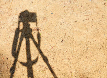 Self-portrait of photographer with camera in hands casting shadow on grey stoney ground with silhouette