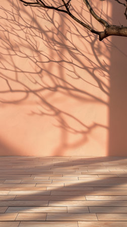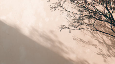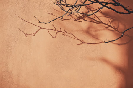 Tree branches cast a soft shadow on a colored wall backdrop, creating a simple setting in the morning light of spring.