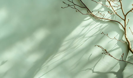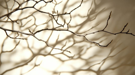 Bare tree branches casting shadow on foggy backdrop, minimalist nature concept