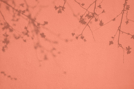 Cherry tree shadows on coral pink concrete wall texture background