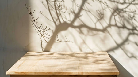 Empty wood table top on beige wall texture with tree leaves shadow background