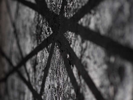Lattice-shaped shadows on a textured surface. Vertical photo, selective focus