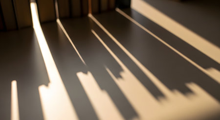 Sunlight casts long, dramatic shadows from a row of books, creating a bold, abstract pattern of light and dark on a surface. The image has a minimalist and contemplative feel, related to knowledge, time, and study.