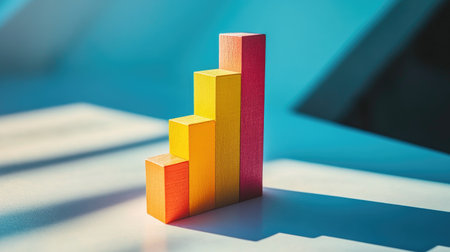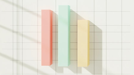 This stock photo features colorful pastel chart blocks set against a minimal grid background, perfect for illustrating data analysis and growth concepts.