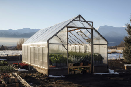 greenhouse, with view of snowy mountain range in the background, created with generative ai