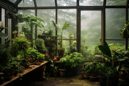 greenhouse, with view of hybrid plants thriving, created with generative ai