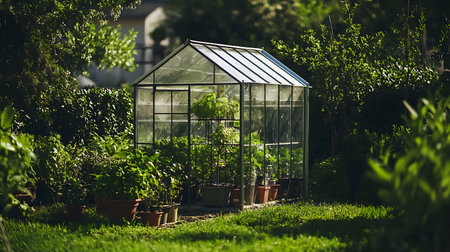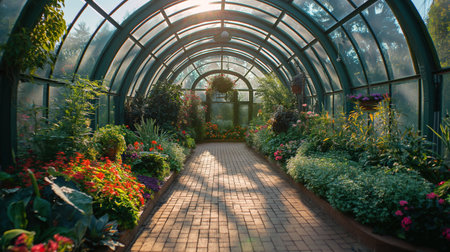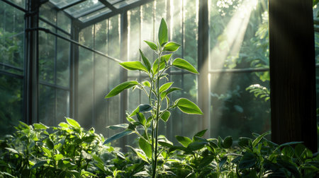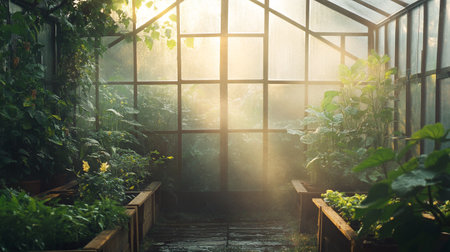 The sunlight filters through the windows of a greenhouse, illuminating a lush garden filled with thriving terrestrial plants. AIG41