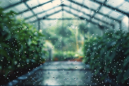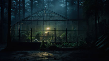 Aesthetic fogged-up greenhouse full of plants in a serene countryside