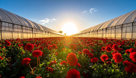 An industrial greenhouse interior captures the interplay of light and space at sunrise, highlighting modern design and technological features in agriculture.