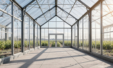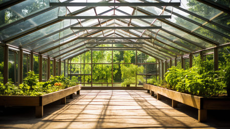 Empty Greenhouse Interior. A vibrant, wide-angle shot of an empty greenhouse. Clear glass panels, metal framing, and a tiled
