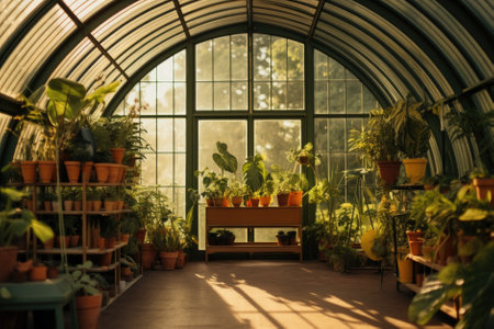 A sun-drenched greenhouse filled with a lush variety of potted plants and foliage, bathed in the warm glow of a sunny day.