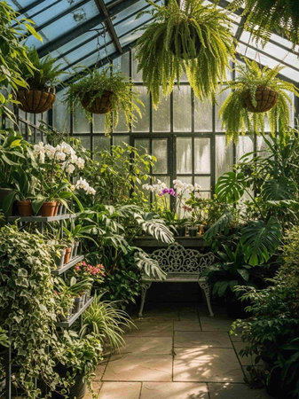 Sunlit paradise in a glasshouse: a vibrant botanical garden filled with exotic plants and orchids