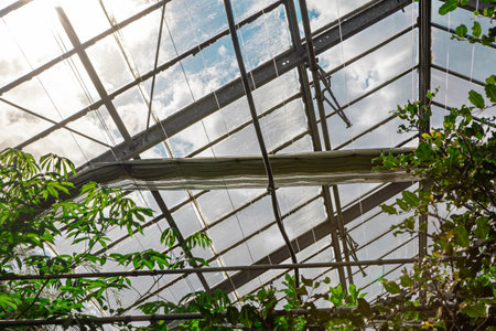 Modern greenhouse. View of the glass roof. Green plants on the sides.
