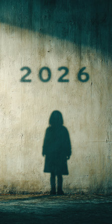 Shadow of a person standing against a textured concrete wall, with the number 2026 above casting a dark, ominous presence, symbolizing an uncertain future and potential societal challenges
