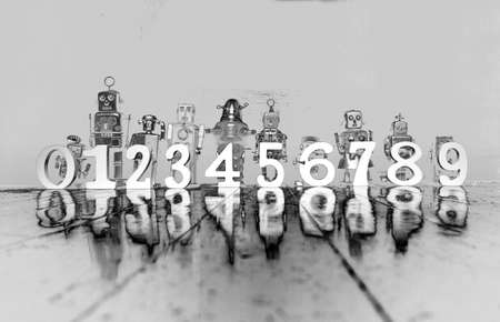 counting retro robots 0 to 9 on a wooden floor with reflection solarized monochrome