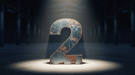 The image features a large, rusted number two prominently displayed in the center of a dimly lit room. The number is illuminated by a focused light source, casting a dramatic shadow and highlighting its weathered texture. The room appears to be industrial, with tall pillars and a dark, moody atmosphere.