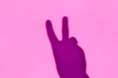 Hand gesture victory shadow on a pink background