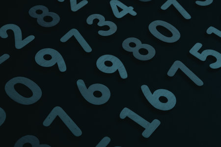 Numbers on black wooden background. Numbers are scattered in the dark.