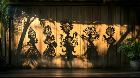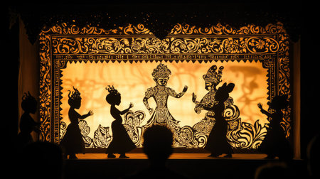 Shadow puppets tell captivating story as intricate figures dance on glowing backdrop during evening festival, enchanting audience their magical silhouettes