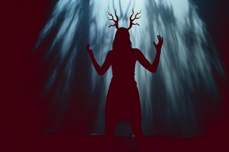 silhouette of a woman with antlers in the dark