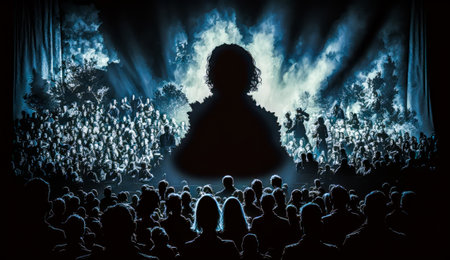 Crowd in dark auditorium watches performer on stage with red lighting, perfect for theater, drama, or performing arts concept visuals.