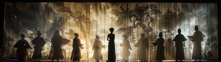 This wide-angle photograph brings to life the traditional Chinese shadow play with a lineup of performers enacting a historical drama. Their silhouettes are set against a tapestry of ancient Chinese landscapes and architecture, bathed in a golden glow. The play of light and shadow, along with the atmospheric backdrops, creates a sense of drama and movement, capturing the essence of this age-old storytelling art form. This image is a vibrant ode to cultural heritage, ideal for artistic and educational use.
