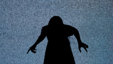 Silhouette against digital television screen. Thriller scene spooky woman crawls walks back in front of big digital screen with white noise.