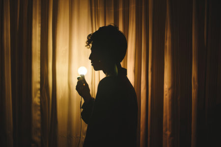 Silhouette of Woman Holding Light Bulb Against Illuminated Curtain.