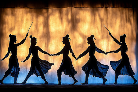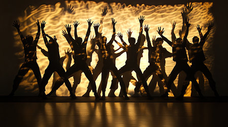 A striking silhouette of a dance troupe showcasing their energetic movements against a backdrop of warm light, emphasizing grace and power in artistic expression.