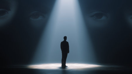 A young woman stands in a spotlight, surrounded by silhouettes pointing at her, symbolizing social judgment and psychological pressure in a cinematic realism style.