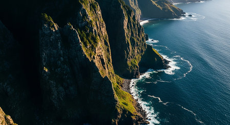 Towering dark cliffs meet the deep blue ocean, where waves crash against the rocks and sea stacks, creating a dramatic coastal scene.