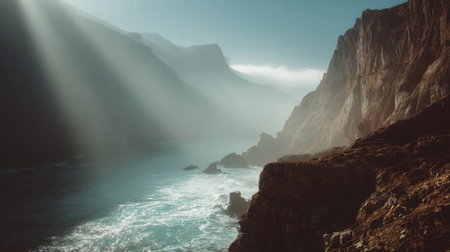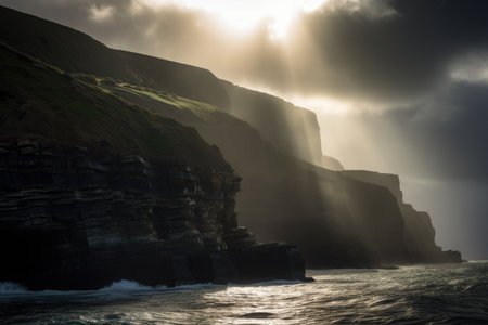 backlit coastal cliffs with streaks of sunlight and clouds, created with generative ai